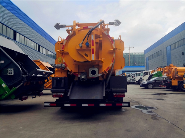 吸污部分:7方污罐,罐體6mmQ235優質碳鋼,配淄博SK-12水循環泵,8米吸污管一根,進氣管加過濾網,防溢閥加高,后蓋卡扣鎖緊,前視污亮管,后尾部加裝1個力拓牌100mm的球閥吸污口150mm排污口,罐體帶舉升功能,后門帶液壓開啟。