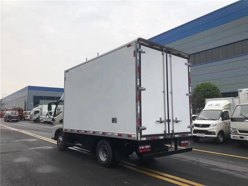 | 配置 | 1.車廂頂部封閉不可開啟,選裝排半駕駛室,2.選裝右側不開門貨廂和單開門貨廂,選裝不同廠家但制冷量相同的冷藏機組,3.發動機HFC4DB3-2E,HFC4DB3-2E3對應的油耗申報值(L/100km)為11.4,11.3,4.側面及后下部防護裝置材料為Q235,連接方式為螺栓連接,后部防護裝置斷面尺寸(長卓?:120mm?0mm,離地高度為440mm,選裝側后防護,側面及后下部防護裝置材料為Al-6061,連接方式為螺栓連接,選裝的后部防護裝置斷面尺寸(長卓?:150mm?5mm離地高度為430mm,5.ABS型號/廠家:CM4XL-4S/4M /廣州瑞立科密汽車電子股份有限公司,6.隨底盤選裝后部燈具,選裝不同樣式的進氣格柵;7.可選裝液壓尾板,尾板收起狀態的水平長度為280mm,當選裝液壓尾板時后部防護裝置材料為510L,后部防護裝置的斷面尺寸(圓形)為:Φ115mm,離地高度為455/480mm,后防護和液壓尾板聯動,避免尾板工作時產生干涉,尾板質量為350Kg, | ||